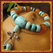 Tibetan Old Mila Amber Bracelet Turquoise Prayer Wrist Mala. Genuine old mila amber beads, genuine turquoise beads, sterling silver beads, sterling silver dorje amulet. The turquoise beads are around 9mm. The bracelet is good for wrist around 170mm. You may contact us for customer-made size.