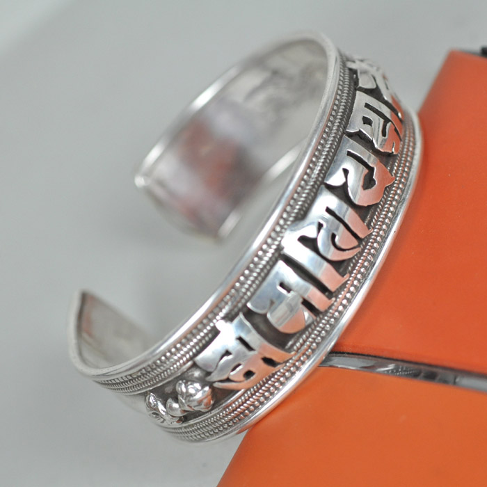 Handcrafted 925 Silver Bangle - Tibetan OM Mani Padme Hum Mantra Bracelet in Sanskrit.